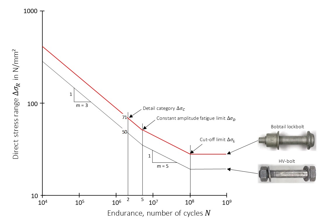 According to EN 1993-1-9 a notch case (detail category) of 50 applies to all threaded bolts and corresponds to an endurable direct stress range  of 50 N/mm² with 2 million load changes. A comparison of notch group 71 to notch group 50 reveals, that the tolerable direct stress range  of Bobtail lockbolts can be more than 40 % higher (71 N/mm² compared to of 50 N/mm² at 2 million load cycles) to reach the same number of cycles. Or in other words, a Bobtail lockbolt loaded with the same stress (single-stage load spectrum) at least three times as long as a conventional threaded fastener, depending on the actual direct stress range and therefore the resulting slope of the Wöhler curve (see Table 4 combined with Figure 2).