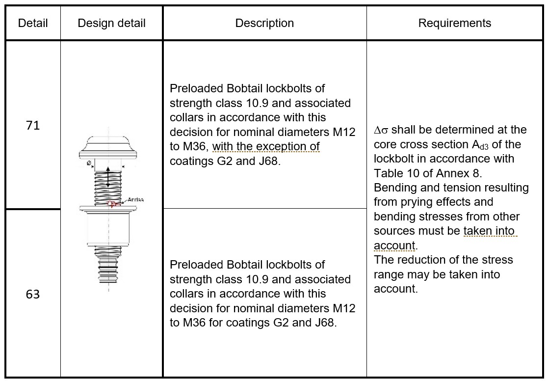 Table 2 summarizes the mechanical characteristics, which were determined and confirmed through an extensive 3rd party test program, for dimensioning the connections with Bobtail lockbolts of diameter M12-M36.