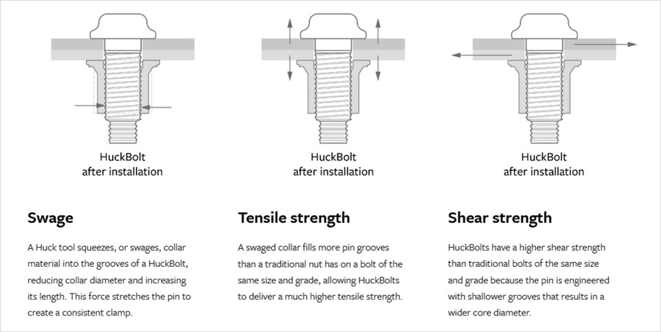 Installation of a Huckbolt®, however, is very different from traditional threaded fasteners, and this is key to how it achieves its exceptional resistance to loosening.