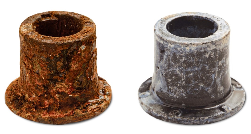 Deux bagues montrant la différence de corrosion après trois semaines de brouillard salin sur des surfaces revêtues et non revêtues.